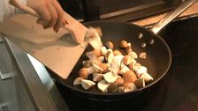 Es geht an die Hauptspeisen: Marvin unterstützt und darf sich gleich mal an die Kalbsleber ran machen. EIn wichtiger Tipp: Leber muss man immer leicht rosig servieren. Wie macht das Salvatore?