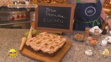 Der Birnen-Pastinaken-Kuchen bekommt seinen Kick durch das Salzkaramell und passt perfekt in die Herbstzeit. Fruchtig wird der Kuchen durch die geriebenen Birnen- und Pastinakenstücke. Konditorin und Buchautorin Cynthia Barcomi stellt euch das Rezept vor: