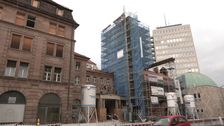 Das Nürnberger Volksbad, damals ein architektonisches Juwel, wurde im Zweiten Weltkrieg schwer beschädigt. Besonders der markante Turm fiel den Bomben zum Opfer und verschwand aus dem Stadtbild. 2016 weckt dann eine Machbarkeitsstudie Hoffnung. Zwei Jahre später beschließt der Stadtrat: Das Volksbad soll wiederbelebt werden, und zwar mit Badebetrieb. Und der Turm? Für ihn haben sich Nürnbergerinnen und Nürnberger selbst stark gemacht. Ende September wurde die neue Holzspitze eingesetzt, heute wurde Richtfest gefeiert.
