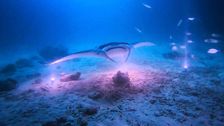 Magisch: Mantarochen gleitet bei Nachttauchgang in Taschenlampen-Kreis