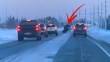 Autofahrer bei Fairbanks im US-Bundesstaat Alaska machten große Augen, als ein Elch einen Highway überquerte. Der Waldbewohner hatte ordentlich mit der vereisten Fahrbahn zu kämpfen.