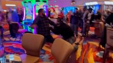 Im US-Bundesstaat Kalifornien ist es in einem Casino zu einer Massenschlägerei gekommen. Videoaufnahmen zeigen, wie es zunächst zu vereinzelten Kämpfen in der Spielhalle kommt, ehe immer mehr Menschen hinzukommen. Mehrere Personen ringen miteinander am Boden, andere gehen mit Faustschlägen aufeinander los.