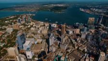 Dar es Salaam, Tansania: Drohne schwebt über blauen Wellen und hohen Türmen