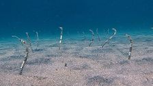 Hypnotisierender Moment vor der Küste von Sumatra in Indonesien: Ein Schnorchler filmte eine Kolonie von Gestreiften Röhrenaalen, die ihre Köpfe aus dem sandigen Meeresboden steckten.