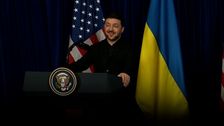 Bei einer gemeinsamen PK mit dem ukrainischen Präsidenten Selenskyj lobt US-Präsident Trump Russland – in irritierender Art und Weise. Selenskyj beweist Selbstbeherrschung, kann sich ein Lächeln über die verwirrende Aussage aber nicht verkneifen.