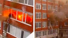 Bei einem Wohnungsbrand in Oral in Kasachstan kletterte ein Feuerwehrmann über eine Leiter durch ein Fenster. Plötzlich kam es zu einer heftigen Explosion.