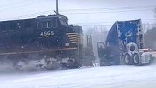 Ein Lastwagen blieb im US-Bundesstaat North Carolina im Schnee auf einem Bahnübergang stecken. Zwei Männer traten rechtzeitig die Flucht an – denn ein Zug näherte sich.