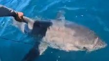 Dieser Angler hat einen sehr großen Fisch an der Rute. Dieser stellt sich wenig später als Weißer Hai heraus. Das Tier wird nach kurzem Kampf wieder freigelassen.