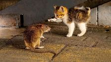 Rollentausch: Riesige Ratte spaziert furchtlos an verdutzten Kätzchen vorbei