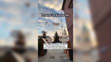 Protest am Hochseil über Karlsruher Weihnachtsmarkt-Geöände