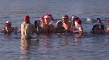 Nichts für Warmduscher: Dutzende Mitglieder der Berliner Seehunde sind am ersten Weihnachtstag in den eiskalten Orankesee gestiegen. Die Wassertemperatur lag nur knapp über dem Gefrierpunkt.