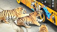Tiger beißt in Reifen: Artgenosse stoppt Attacke auf Safari-Bus