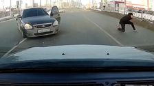 In der russischen Großstadt Omsk ist ein Mann aus seinem fahrenden Auto herausgeschleudert worden und über die Fahrbahn gerutscht. Videoaufnahmen zeigen, wie der Wagen Fahrers heftig gerammt wird. Wie durch ein Wunder erlitt der Mann allerdings offenbar keinerlei Verletzungen. Auf dem Video ist zu sehen, wie er nach dem Unfall sofort wieder auf die Füße springt.