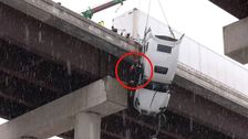 Über dem Abgrund: Lkw baumelt von Brücke – Fahrer muss fünf Stunden lang ausharren