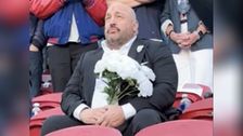 Kevin James traurig und alleine mit Blumenstrauß bei Super Bowl