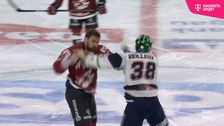 Bereits in den vergangenen Duellen ging es heiß her. Auch zum Start in dieses Duell der ewigen Rivalen fliegen sofort die Fäuste. Yannick Veilleux und Tobias Fohrler lassen schon nach nicht einmal zwei Minuten die Handschuhe fallen.