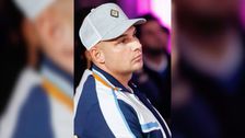 Beim Hallenturnier "Bretterknaller" in Cottbus genehmigt sich Mario Basler einen Schluck Bier von den Fans, während das Spiel läuft.