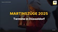 Im November 2025 ziehen wieder Martinszüge durch Düsseldorf. In vielen Stadtteilen der Landeshauptstadt findet ein Umzug statt, u.a. an diesen Terminen: Altstadt: Mo. 10.11., 17 Uhr, ab Stiftsplatz Angermund: Fr. 7.11., um 17:15 Uhr, ab Am Litzgraben 28a Benrath: Do. 6.11., 17 Uhr, ab Erich-Müller-Straße Di. 11.11., 17:25 Uhr, ab Am Mönchgraben 47 Do. 6.11., 16:15 Uhr, ab Grundschule Einsiedelstraße Bilk: Mi. 5.11., 17 Uhr, ab Im Dahlacker Mo. 10.11., 17:30 Uhr, ab Siegplatz/Ecke Wupperstraße Derendorf: Mo. 3.11., 17 Uhr: ab Bülowstraße 5a Fr. 7.11., 17 Uhr: ab Golzheimer-/Collenbachstraße Mo. 3.11., 17 Uhr: ab Oldenburger Straße 6 Gerresheim: Di. 11.11., um 17 Uhr, ab Quadenhofstr. Do. 13.11., um 17 Uhr, ab Am Poth Grafenberg: Sa. 8.11., um 17:30 Uhr, ab Altenbergstr. Hellerhof: Fr. 7.11., um 17 Uhr, ab Ingeborg-Bachmann-Str. Heerdt: Do. 6.11., um 16:30 Uhr, ab Rheinallee Itter: Fr. 14.11., um 17:15 Uhr, ab Feuerwacher Itter Kaiserswerth: Do 6.11., um 16:45 Uhr, ab Fliednerstr. Kalkum: Sa. 8.11., um 17 Uhr, ab Unterdorfstr. 1 Knittkuhl: Do. 12.11., um 17:30 Uhr, ab Am Mergelsberg 1 Lichtenbroich: Mi. 5.11., um 17 Uhr, Einbrunger Weg Lohausen: Fr. 7.11., um 17 Uhr, ab Schulhof Im Grund 78 Lörick: Fr. 14.11., ab 17:15 Uhr, ab Kaarster Weg/Ecke Glehner Weg Niederkassel: Mo. 10.11., um 17:30 Uhr, ab Schulhof Niederkasseler Str. 36 Oberbilk: Do. 6.11., um 17 Uhr, ab Lessingplatz Stockum: Do. 6.11., um 17 Uhr, ab Carl-Sonnenschein-Str./Ecke Deikerstr. Pempelfort: Mo. 3.11., um 17 Uhr, ab Bülowstr. 5 Urdenbach: Do. 13.11., um 17:15 Uhr, ab Südallee 100 Fr. 14.11., um 17 Uhr, ab Kolhagenstr. Unterrath: Do. 6.11., um 17 Uhr, ab Schützenplatz Unterbach: Di. 11.11., um 16:45 Uhr, ab Gerresheimer Landstr. Wersten: Do. 6.11, 18 Uhr, ab Am Massenberger Kamp Drei Züge am Fr. 7.11., um 17 Uhr, ab Lützenkircher Str., ab Gelbe Brücke am Gansbruch und ab Bruchhausenstr.