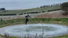 Herrlicher Moment in den Yorkshire Wolds in England: Ein Sportler nutzte die Kältewelle kreativ und glitt über einen winzigen, zugefrorenen Teich. Trotz der Mini-Eisfläche zeigte der 56-Jährige gekonnte Figuren und Sprünge.