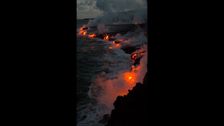 Sainte‑Rose, Réunion – 22. März 2026: Am 22. März 2026 teilte @le._.fl0 in Sainte‑Rose, Frankreich, ein Video, das Lava aus einem andauernden Vulkanausbruch zeigt, wie sie an der Seite einer Klippe entlangfließt. Die Aufnahme zeigt die Szene an der Route des Laves, wo der Lavastrom auf den Ozean trifft und dabei Rauch sowie Dampf erzeugt. Die Aktivität war Teil des fortdauernden Ausbruchs des Vulkans Piton de la Fournaise, der seit Mitte Februar aktiv war. Dabei entstanden Lavaströme, die das Meer erreichten, neues Land bildeten und dampfgefüllte Schwaden aufsteigen ließen, wenn das geschmolzene Gestein auf das Wasser traf.