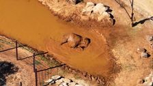 Elefanten im Werribee Open Range Zoo nutzen Schlammpfützen, um sich abzukühlen. Die Herde, einschließlich der Kälber, genießt das Planschen, während das Männchen Luk Chai, 4.526 kg, im Schlamm liegt.