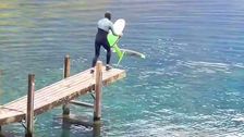 In Montreux in der Schweiz beobachtete ein Surfer einen Profi beim eleganten Start mit dem Hydrofoil. Dann wollte es der Mann dem Experten gleichtun – das ging grandios daneben.