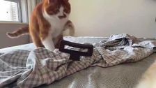 Im chinesischen Tianjin wurde eine neugierige Katze für ihren Mut bestraft: Das Haustier spielte mit einer Haarspange auf dem Bett – und hob plötzlich in Panik ab.