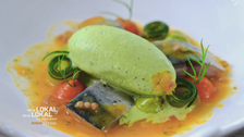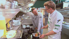 Felix schaut Johannes in der Küche für die Vorspeise über die Schulter: Makrele mit Gurke und Dill im Ceviche-Sud. Johannes kommt aus der Patisserie und arbeitet besonders präzise mit seinen Zutaten. Schmeckt Felix diesen Feinschliff heraus?