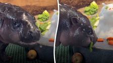 Zwergflusspferd-Baby Hugo genießt im Zoo von Michigan eine Leckerei aus Schnee, die wie eine Miniaturausgabe seiner selbst geformt ist. (Bildnachweis: John Ball Zoo/TMX)