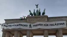 Am Donnerstagnachmittag kletterten Demonstranten auf das Brandenburger Tor in Berlin. Sie hissten ein Banner mit der Aufschrift "Nie wieder Völkermord - Freiheit für Palästina"