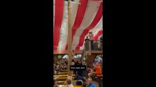 Würzburger Hofbräu-Chef Axel Kochinki wettete, dass niemand den Rekord fürs Baumstamm-Kraxeln brechen kann.