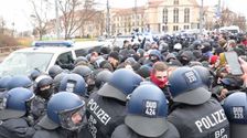 Hunderte Menschen demonstrieren in Dresden gegen einen rechtsextremen Aufmarsch. Es gibt Sitzblockaden, die Polizei setzt Pfefferspray ein.