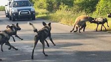 Wildhunde und Hyänen sorgten für einen Stau im Kruger-Nationalpark in Südafrika: Die Raubtiere gerieten auf der Straße aneinander und brachten den Verkehr zum Erliegen.