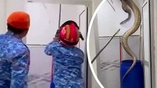 Im malaysischen Bundesstaat Kedah bekam eine Familie ungebetenen Besuch: Eine knapp fünf Meter lange Pythonschlange hatte es sich im Badezimmer gemütlich gemacht – und krachte durch die Decke.