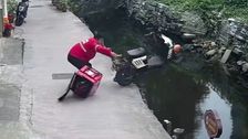 Missgeschick mit nassen Folgen in der chinesischen Provinz Guangdong: Der Roller eines Lieferfahrers kippte um – beim Aufheben ging alles schief.