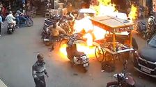Auf einer belebten Straße in Delhi in Indien fing die Gasflasche eines Verkäufers plötzlich Feuer. Der Mann rollte die Flasche weg – und machte damit alles noch schlimmer.