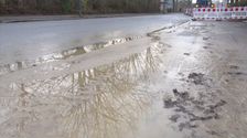 Wasser fließt nach einem Rohrbruch in Hamburg in die Nebenstraßen rund um eine Grundschule. Hamburg Wasser arbeitet an der Schadensstelle.