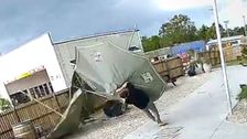 Während eines Sturms im australischen Bundesstaat Queensland wollte ein Hotelmitarbeiter die Sonnenschirme in Sicherheit bringen. Doch die Aufgabe hatte ihre Tücken.
