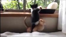 Als sie alleine nicht nach oben kommen, bauen diese zwei Katzenbabys kurzerhand eine Räuberleiter.