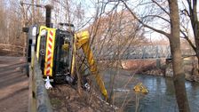 Unfall am Lederersteg: Lkw kippt mit Arbeitsbühne in die Pegnitz - eine Person verletzt