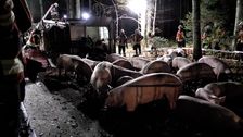 Ein Tiertransporter kippt in einem Waldabschnitt um. Einige Schweine werden dabei getötet.
