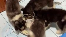 Vier Welpen aus Antipolo auf den Philippinen sorgen mit einer „Fress-Choreografie“ für Lacher: Die süßen Vierbeiner futterten im Kreisverkehr ihren Napf leer.