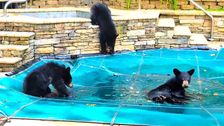 In Asheville im US-Bundesstaat North Carolina tobten sich drei kleine Bären auf einem abgedeckten Swimmingpool aus. Die Jungtiere planschten in einer Pfütze – während Mama-Bär vom Zaun aus zusah.