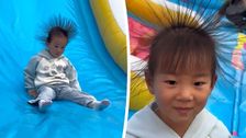 In der chinesischen Provinz Anhui rutschte ein kleines Mädchen auf einer Hüpfburg herunter. Der Spaß hatte unerwartete Folgen für die Frisur des Kindes.