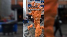 Die orangefarbene Folie fällt auf: Zahlreiche Denkmäler in der City sind darin eingewickelt. Aber was hat es damit auf sich? Es geht um Aufmerksamkeit.