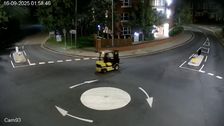 Betrunkener fährt mit einer Whiskeyflasche in der Hand auf einem Gabelstapler.