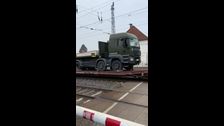 Ein Zug mit Militärfahrzeugen rollt durch die Lausitz.
