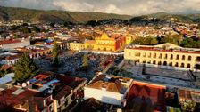 Gleiten Sie mit dieser stimmungsvollen Drohnenaufnahme von San Cristóbal de las Casas in Mexiko durch das nebelverhangene, nach Kiefern duftende Hochland von Chiapas. Die Reise beginnt über der ikonischen gelben Fassade der Kathedrale San Cristóbal, deren rotes Ziegeldach im sanften Licht der Berge erstrahlt, während die Drohne die lebhafte Plaza de la Paz umkreist.