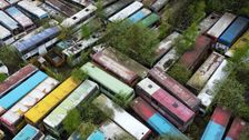 Drohnenaufnahmen enthüllen „Großbritanniens größten Busfriedhof“, vollgepackt mit Hunderten von verlassenen Bussen. Die verrosteten Fahrzeuge, viele davon von der Natur zurückerobert, bilden eine gespenstische, apokalyptische Szene, die urbane Entdecker anzieht.