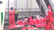 Am Hamburger Hafen haben Aktivisten Gleise blockiert und den Verkehr auf Köhlbrandbrücke und Burchardkai beeinträchtigt. Mit der Aktion protestieren sie gegen Waffenexporte nach Israel und zeigen Solidarität mit Palästina.